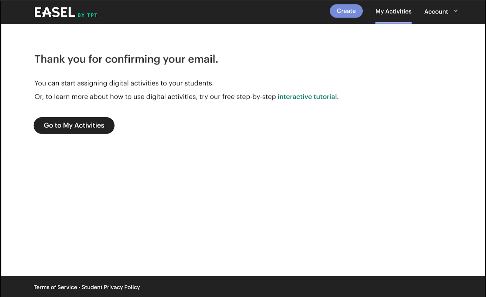 The first time you choose to assign an Easel Activity using the shareable link feature, you will be required to verify your school email address. To do so, simply enter your school name and email address and TPT will send the verification link to your inbox.